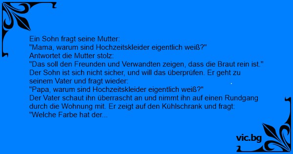 Синот ја прашува мајка си: - Мамо, зошто венчаниците се бели? Мајката одговора: - Венчаницата покажува на пријателите и Роднините дека невестата е чиста. Синот за секој случај го прашува истото...