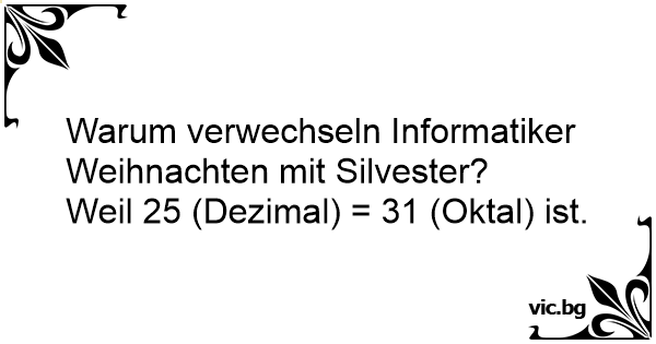 Warum verwechseln Informatiker Halloween und Weihnachten? Oct(31) == dec(25)
