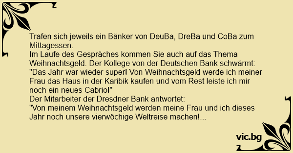 Im Laufe des Gespräches kommen Sie auch auf das Thema Weihnachtsgeld. Der Kollege von der Deutschen Bank schwärmt: