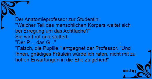 "Falsch, die Pupille." entgegnet der Professor. "Und Ihnen, gnädiges Fräulein würde ich raten, niсhт mit zu hohen Erwartungen in die Ehe zu gehen!"