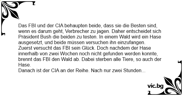 Das FBI und der CIA behaupten beide, dass sie die Besten sind, wenn es darum geht, Verbrecher zu jagen. Daher entscheidet sich Präsident Bush die beiden zu testen. In einem Wald wird ein Hase ausgesetzt, und beide müssen versuchen ihn einzufangen.
