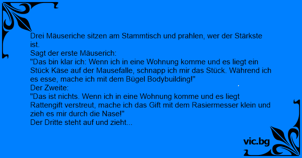 mutige Mäuse Три мишки седят и си говорят за подвизите си: Tre möss sitter i en bar och skryter för varandra. Den första musen sveper en Tequila och säger, - Jag brukar leka med råttfällan. Jag springer in i den med avsikt och låter den smälla igen. Jag tar tag i pressjärnet och häver den fram och tillbaka...