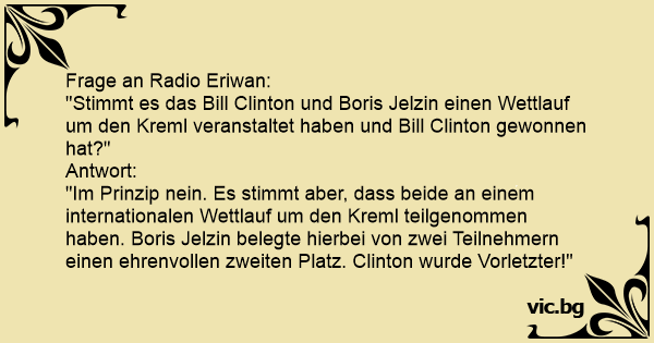 "Im Prinzip nein. Es stimmt aber, dass beide an einem internationalen Wettlauf um den Kreml teilgenommen haben. Boris Jelzin belegte hierbei von zwei Teilnehmern einen ehrenvollen zweiten Platz. Clinton wurde Vorletzter!"