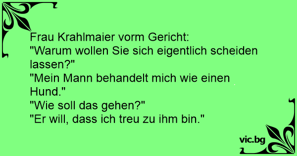 -Dígame ¿Cuál es el motivo por el quiere divorciarse de su esposo? - Mi marido me trata como si fuera un perro. - ¿La maltrata... le pega? - ¡No! ¡Quiere que le sea fiel!