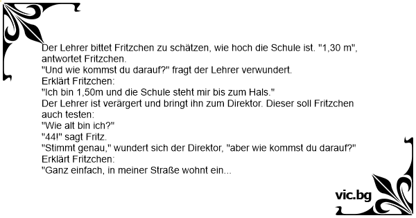 Der Lehrer bittet Fritzchen zu schätzen, wie hoch die Schule ist. "1,30 m", antwortet Fritzchen.