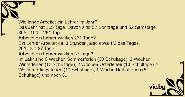 Wie lange Arbeitet ein Lehrer im Jahr? Das Jahr hat 365 Tage. Davon sind 52 Sonntage und 52 Samstage. 365 - 104 = 261 Tage Arbeitet ein Lehrer wirklich 261 Tage? Ein Lehrer Arbeitet ca. 8 Stunden, also etwa 1/3 des Tages. 261 : 3 = 87 Tage Arbeitet ein Lehrer wirklich 87 Tage? Im Jahr sind 6 Wochen Sommerferien (30 Schultage), 2 Wochen Winterferien (10 Schultage), 2 Wochen Osterferien (10 Schultage), 2 Wochen Pfingstferien (10 Schultage), 1 Woche Herbstferien (5 Schultage) und noch 8 bewegliche Tage. Ergibt zusammen 73 Schultage. 87 - 73 = 14 Tage Arbeitet ein Leher wirklich 14 Tage im Jahr? Es gibt ja auch noch Feiertage: Neujahr, 1. Mai, Fronleichnam, Allerheiligen, Tag der deutschen Einheit, Christi Himmelfahrt. Ergibt zusammen 6 Tage. 14 - 6 = 8 Tage Arbeitet ein Lehrer 8 Tage im Jahr? Moment, da entfallen ja 7 Tage wegen Ausflüge, Abiprüfungen, Wandertage! 8 - 7 = 1 Tag Und was ist wenn ein Lehrer mal krank ist?
