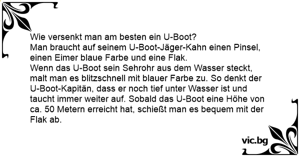 Wenn das U-Boot sein Sehrohr aus dem Wasser steckt, malt man es blitzschnell mit blauer Farbe zu. So denkt der U-Boot-Kapitän, dass er noch tief unter Wasser ist und taucht immer weiter auf. Sobald das U-Boot eine Höhe von ca. 50 Metern erreicht hat, schießt man es bequem mit der Flak ab.