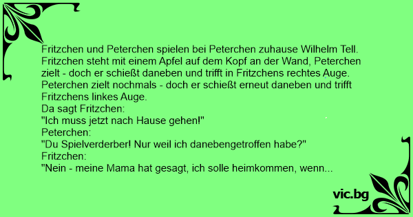 Fritzchen steht mit einem Apfel auf dem Kopf an der Wand, Peterchen zielt - doch er schießt daneben und trifft in Fritzchens rechtes Auge. Peterchen zielt nochmals - doch er schießt erneut daneben und trifft Fritzchens linkes Auge.