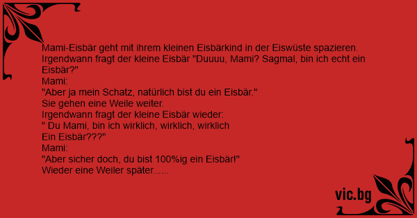 Ein kleiner Eisbär geht zu seiner Mutter und fragt: „Mama, bist Du auch ein Eisbär?“ „Ja, sicher.“ „Wenn Du einer bist bin ich sicher auch einer. Und Papa? Ist das auch ein Eisbär?“ „Ja; ein großer...