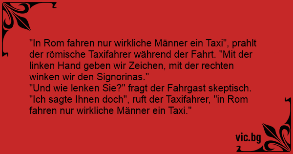 "Ich sagte Ihnen doch", ruft der Taxifahrer, "in Rom fahren nur wirkliche Männer ein Taxi."
