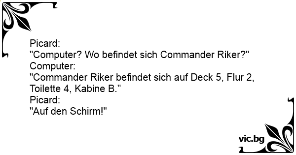 "Commander Riker befindet sich auf Deck 5, Flur 2, Toilette 4, Kabine B."
