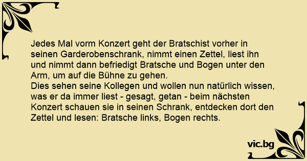 Dies sehen seine Kollegen und wollen nun natürlich wissen, was er da immer liest - gesagt, getan - beim nächsten Konzert schauen sie in seinen Schrank, entdecken dort den Zettel und lesen: Bratsche links, Bogen rechts.