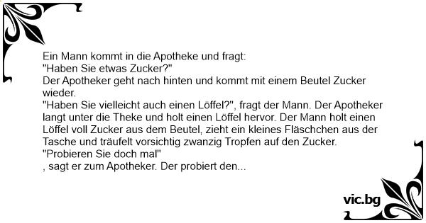 "Haben Sie vielleicht auch einen Löffel?", fragt der Mann. Der Apotheker langt unter die Theke und holt einen Löffel hervor. Der Mann holt einen Löffel voll Zucker aus dem Beutel, zieht ein kleines Fläschchen aus der Tasche und träufelt vorsichtig zwanzig Tropfen auf den Zucker.