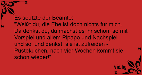 "Weißt du, die Ehe ist doch nichts für mich. Da denkst du, du machst es ihr schön, so mit Vorspiel und allem Pipapo und Nachspiel und so, und denkst, sie ist zufreiden - Pustekuchen, nach vier Wochen kommt sie schon wieder!"