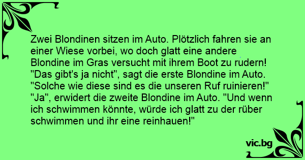 Zwei Blondinen sitzen im Auto. Plötzlich fahren sie an einer Wiese vorbei, wo doch glatt eine andere Blondine im Gras versucht mit ihrem Boot zu rudern! "Das gibt's ja niсhт", sagt die erste Blondine im Auto.