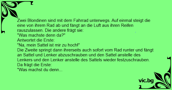 Zwei Blondinen sind mit dem Fahrrad unterwegs. Auf einmal steigt die eine von ihrem Rad ab und fängt an die Luft aus ihren Reifen rauszulassen. Die andere frägt sie: