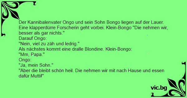 Vater Kannibale geht mit seinem Sohn spazieren. Da treffen sie auf eine dicke, fette Frau und der Junge sagt zu seinem Vater: "Du Papi, essen wir die Frau dort?" Der Vater sagt nur: "Nein, mein...