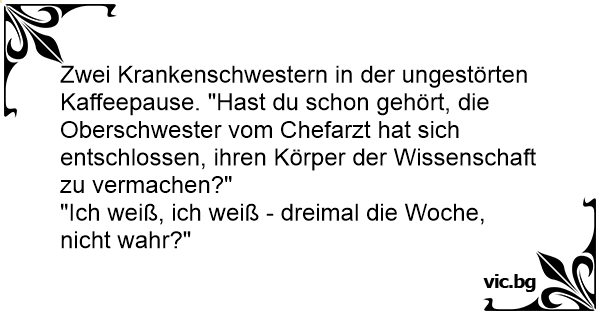 Zwei Krankenschwestern in der ungestörten Kaffeepause. "Hast du schon gehört, die Oberschwester vom Chefarzt hat sich entschlossen, ihren Körper der Wissenschaft zu vermachen?"
