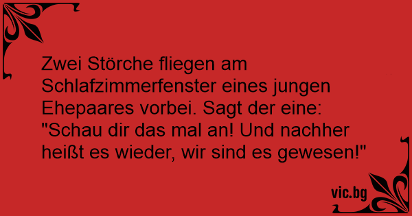 Zwei Störche fliegen am Schlafzimmerfenster eines jungen Ehepaares vorbei. Sagt der eine: