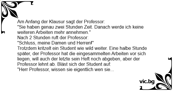 Trotzdem kritzelt ein Student wie wild weiter. Eine halbe Stunde später, der Professor hat die eingesammelten Arbeiten vor sich liegen, will auch der letzte sein Heft noch abgeben, aber der Professor lehnt ab. Bläst sich der Student auf: