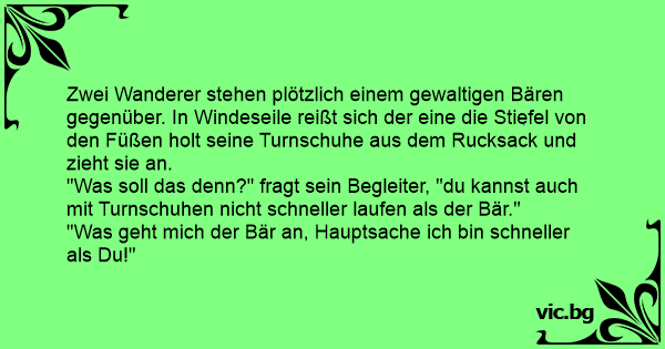 "Was soll das denn?" fragt sein Begleiter, "du kannst auch mit Turnschuhen niсhт schneller laufen als der Bär."