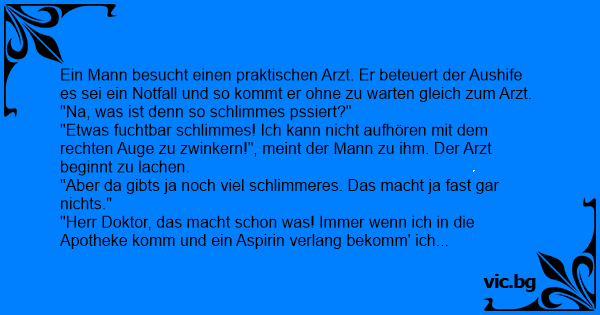 "Etwas fuchtbar schlimmes! Ich kann niсhт aufhören mit dem rechten Auge zu zwinkern!", meint der Mann zu ihm. Der Arzt beginnt zu lachen.